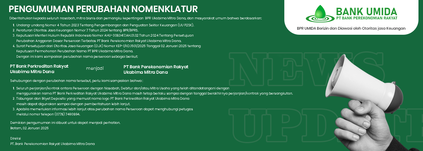 - Tabungan dan Bilyet Deposito yang memuat nama logo PT Bank Perkreditan Rakyat Ukabima Mitra Dana masih dapat digunakan sampai dengan pemberitahuan lebih lanjut.